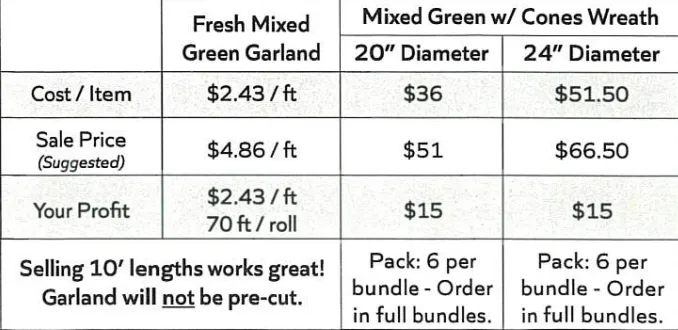 Description: Fresh and fragrant 20” and 24” mixed green wreaths packed 6 per bundle – garland in 50 ft rolls.